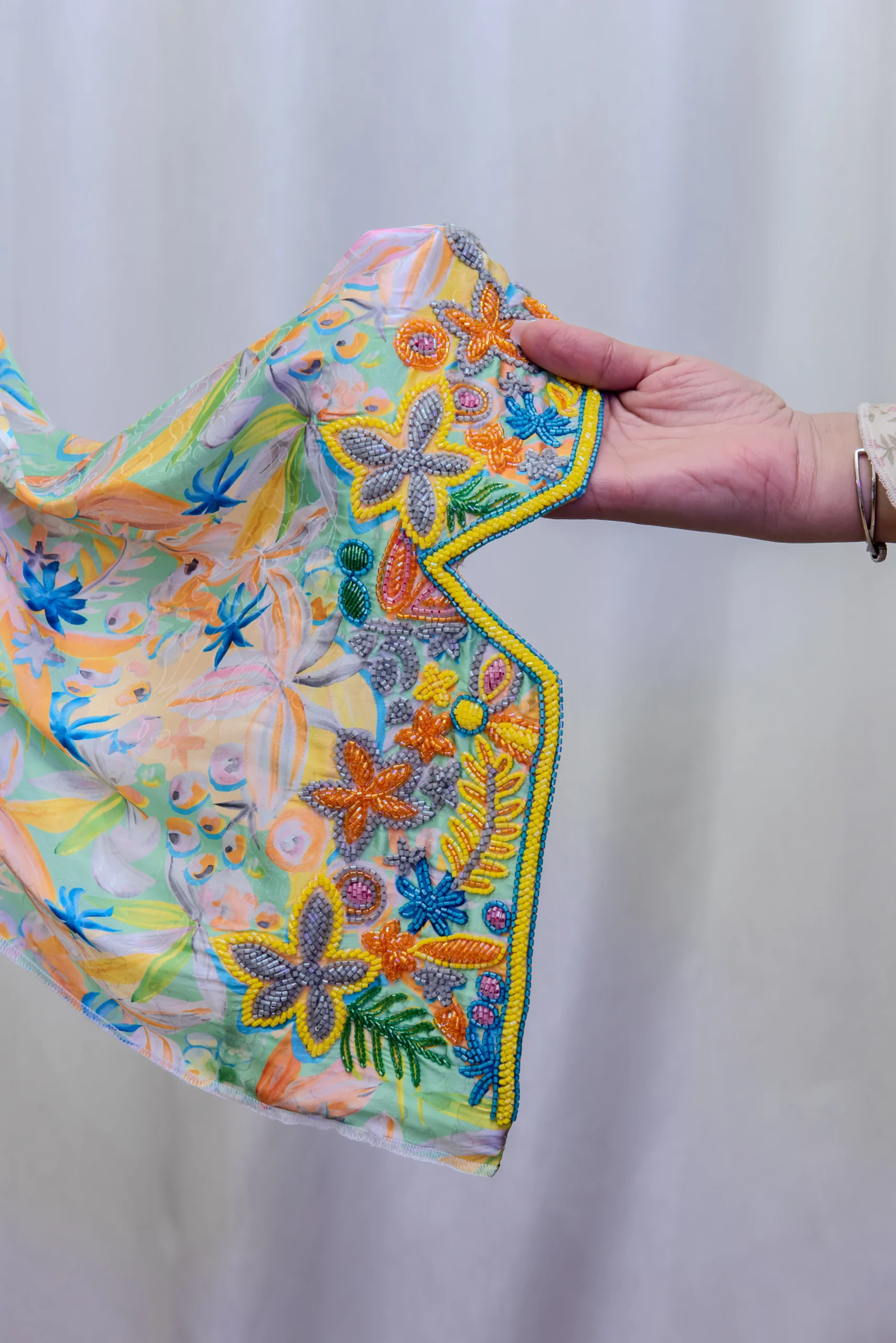 شغل خرز يدوي يضيف لمسة رقي، وقماش حرير جاكارد يعطيها أناقة ما لها مثيل 💫