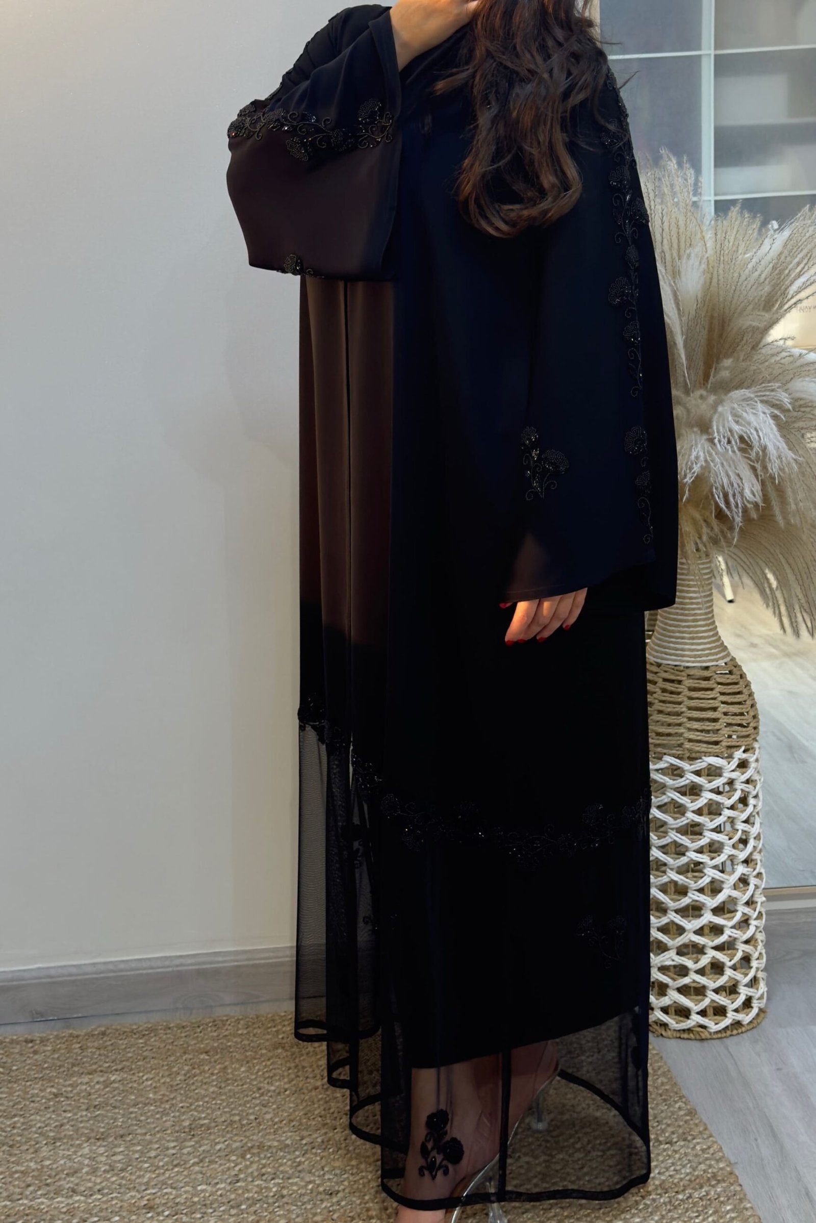 قماشها ندى أنيق، مع تور في أسفل العباة تزيدها لمسة رقي، وشغل الشك اليدوي بالأسود يعطيها طابع خاص 💫