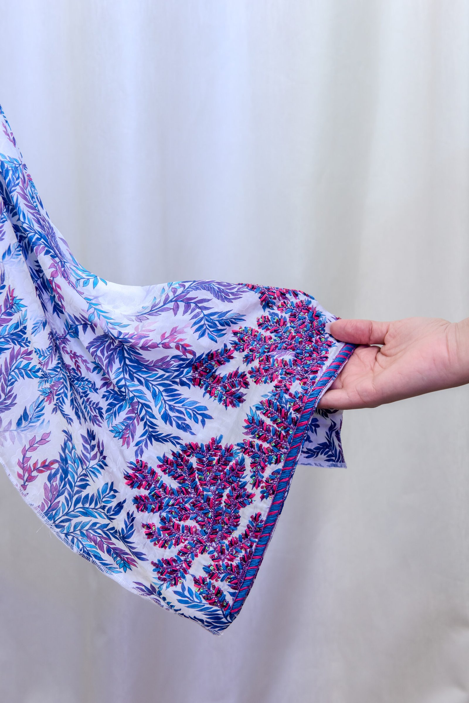 كندورة بألوان متداخلة من الوردي والبنفسجي والأزرق … فخمة بشغل الشك اليدوي من الخرز وخيوط الصوف!